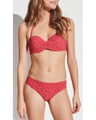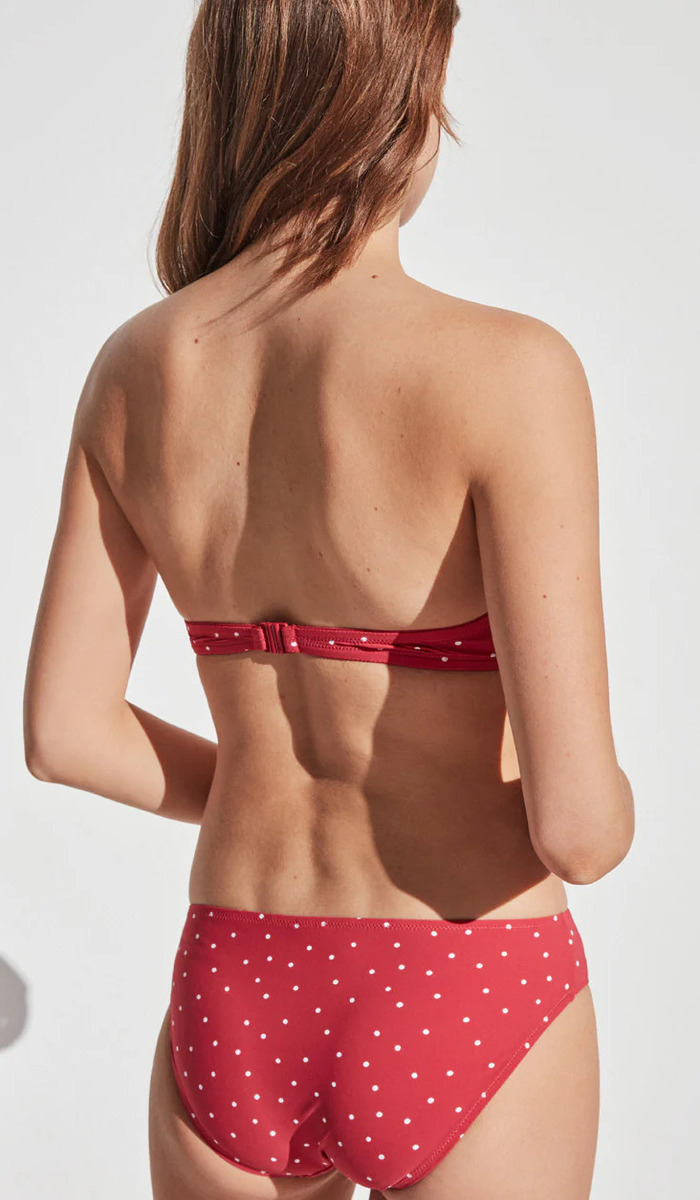 Яркий, игривый и одновременно элегантный – этот купальник создан, чтобы привлекать внимание. Бюстгальтер-бандо с формованными чашечками обеспечивает хорошую поддержку и соблазнительную форму, а съемные бретели позволяют носить его так, как удобно именно вам с бретелями или без, для равномерного загара. Классические плавки-слипы дарят комфорт и уверенность в движении, а красный цвет в белый горох придает купальнику винтажный шарм и летнее настроение.