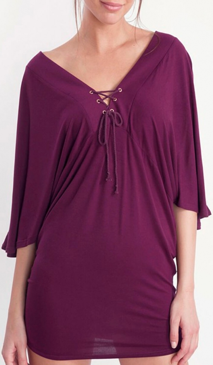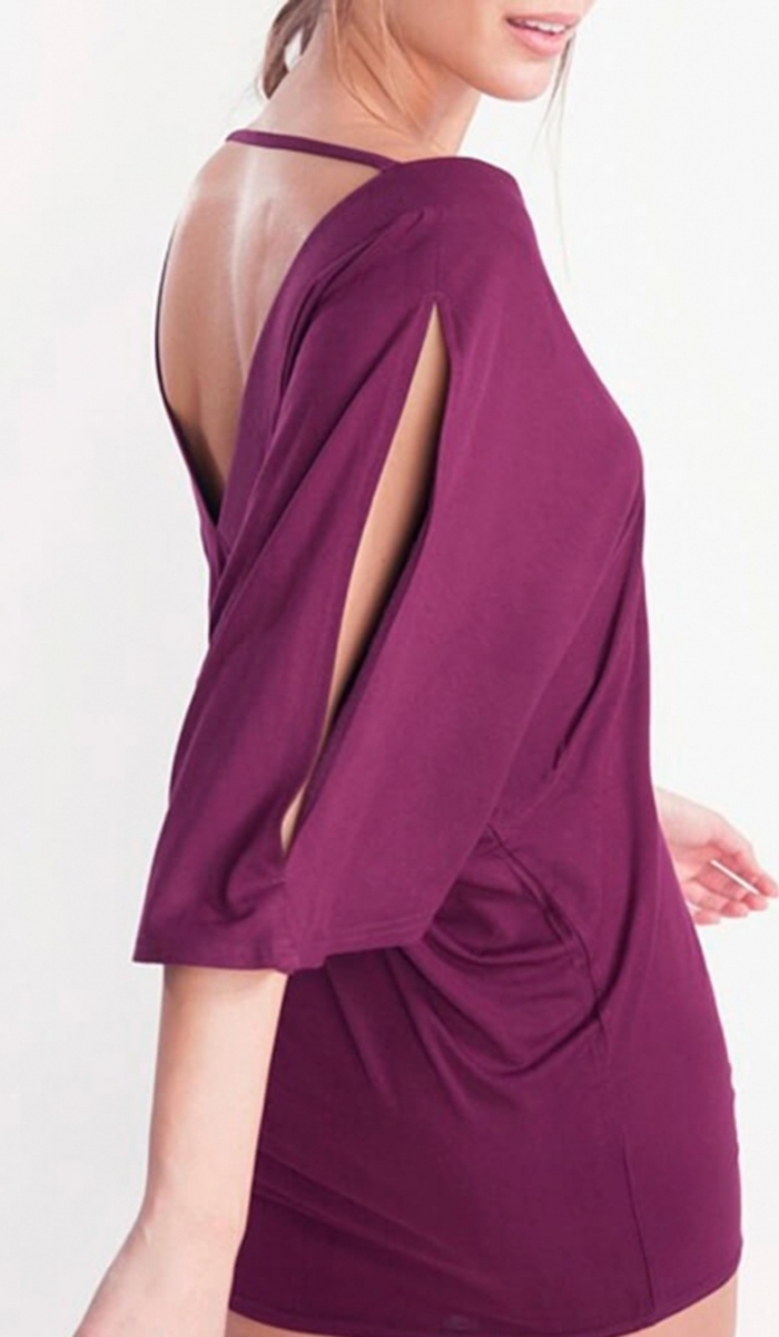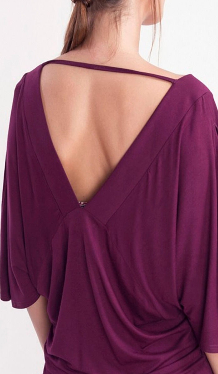 Эта модель винного цвета – баланс между сдержанной элегантностью и откровенным соблазном. Игривая шнуровка в зоне декольте интригует, позволяя вам самой определять глубину. Рукава 3/4 с эффектными разрезами от самого плеча придают образу невесомости: они оживают при каждом жесте, нежно обнажая кожу. И настоящий секрет вашей уверенности – глубокий V-образный вырез на спинке, что делает силуэт безупречным с любого ракурса.