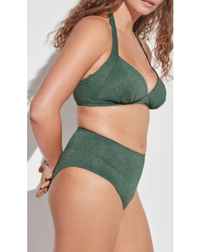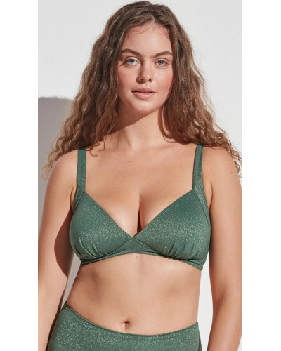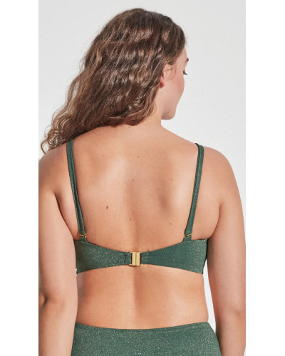 Огорніть себе блиском! Неймовірно м'який блискучий матеріал зеленого кольору дарує відчуття розкоші на шкірі. Забудьте про дискомфорт: формовані чашки забезпечують ідеальну підтримку та форму без жорстких кісточок. Інноваційна конструкція з піною створює бажаний об'єм та природний силует. Широкі бретелі — не лише елегантна деталь, а й запорука комфорту, а їхня мультипозиційність дозволяє адаптувати модель під будь-який образ чи активність. Це не просто купальник, це ваша впевненість і сексуальність.