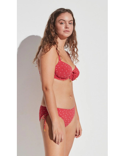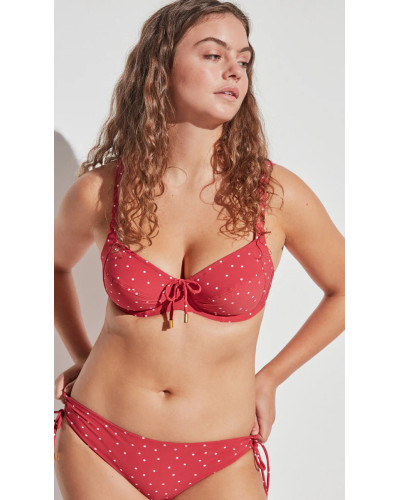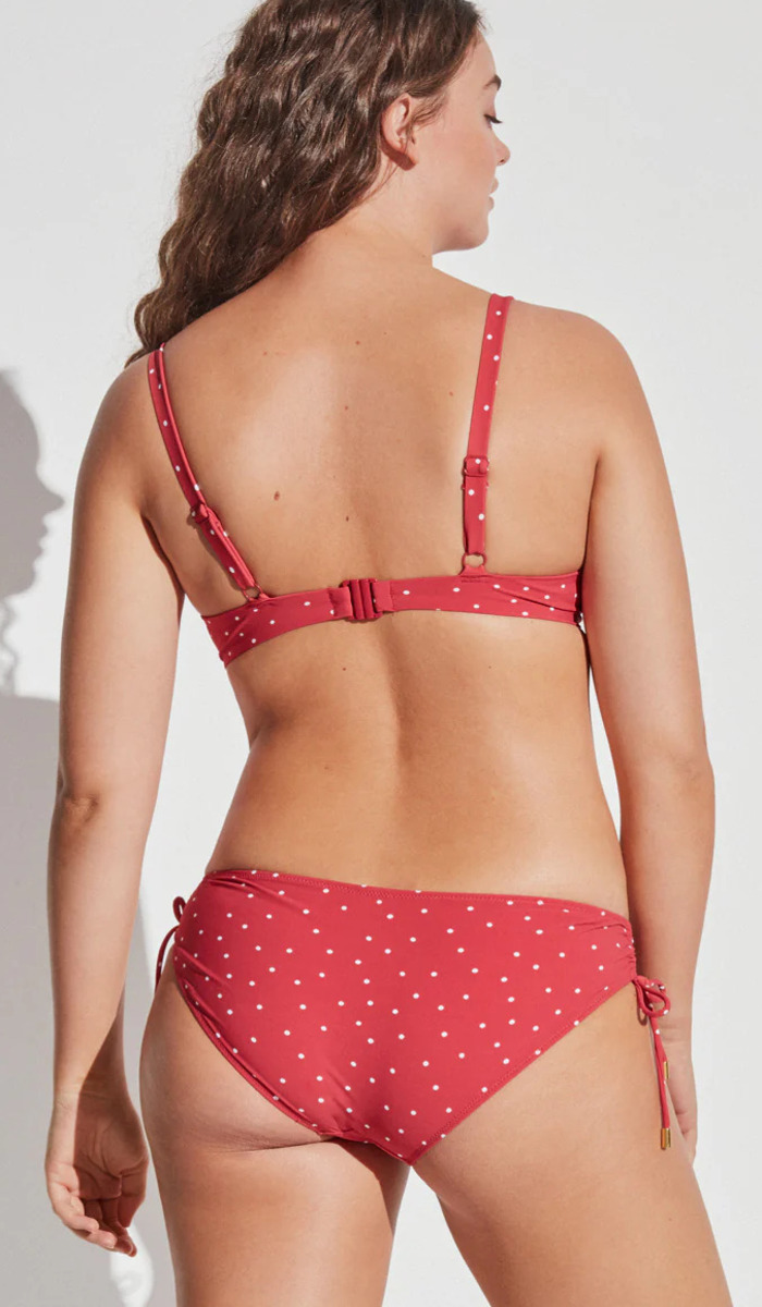 Елегантний та зручний купальник з м’якими чашками та кісточками створений для впевненої підтримки та красивої форми бюста. Модель доповнена класичними трусиками-сліп, що завдяки затяжкам по боках забезпечують комфортну посадку та універсальний стиль, який підкреслює жіночність. Цей червоний у білий горох комплект поєднує в собі функціональність і витончену естетику, роблячи його ідеальним вибором для пляжного відпочинку.