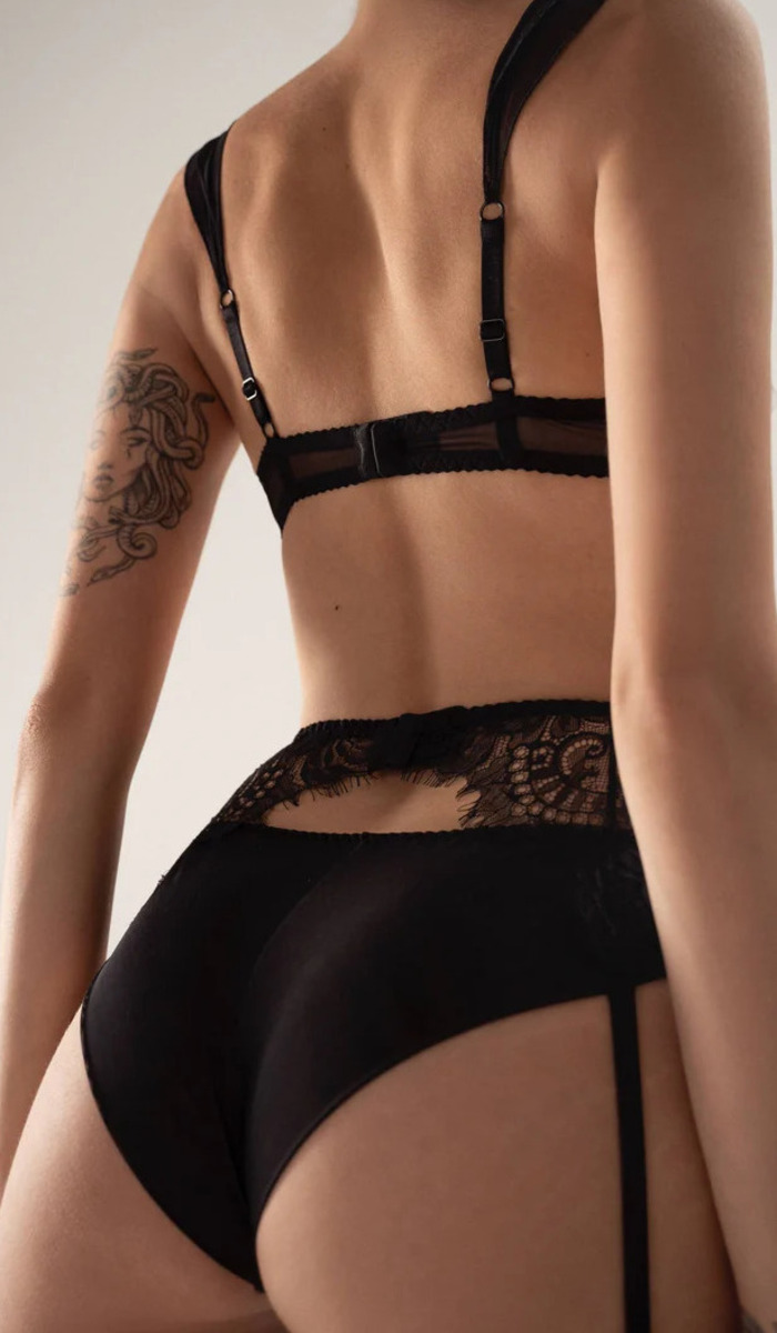 Головною окрасою моделі є розкішне мереживо шантильї, що лягає на шкіру невагомою вуаллю. Унікальний візерунок із філігранними завитками створює ефектний візуальний акцент, майстерно моделюючи силует і підкреслюючи лінію стегон. Кожна деталь цього аксесуара продумана для вашої впевненості: надійні пажі міцно тримають панчохи, а м’яке преміальне мереживо забезпечує комфорт протягом усього вечора. Чорний колір та складна фактура орнаменту у комплекті з бюстгальтером та трусиками від цього ж бренду перетворюють пояс на справжній артоб’єкт у вашому гардеробі.