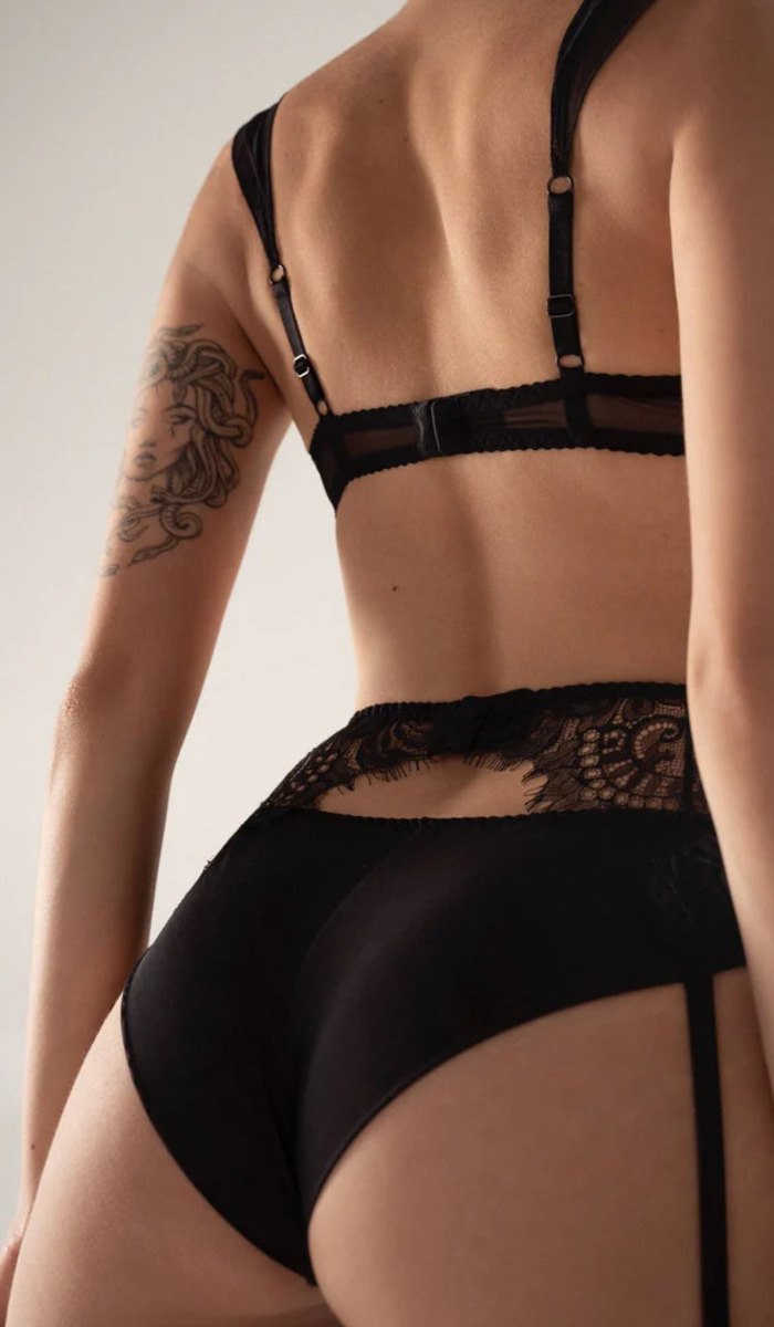 Ця модель — ідеальний баланс між тендітною прозорістю та вишуканим дизайном. Поєднання невагомої мікросітки та розкішного мережива з ажурними краями створює ефект витонченої гри на шкірі, підкреслюючи вашу природну привабливість. Занижена лінія талії робить силует звабливим, а вертикальний анатомічний шов позаду акцентує увагу на формах, додаючи їм ідеальної округлості.