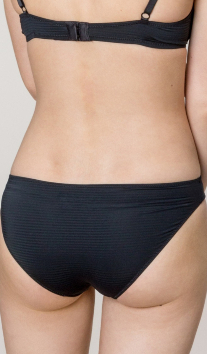Глибокий колір у поєднанні з ледь помітною дрібною смужкою створює витончений візуальний ефект, а мініатюрний декоративний ґудзик на передній деталі додає моделі особливої вишуканості та унікальності. Злегка занижена лінія талії забезпечує ідеальну посадку під будь-який одяг, підкреслюючи природну красу жіночих форм. Еластичний пояс м’яко фіксує білизну на тілі, не створюючи зайвого тиску, а делікатна бавовняна ластка гарантує бездоганну гігієну та відчуття свіжості протягом усього дня.