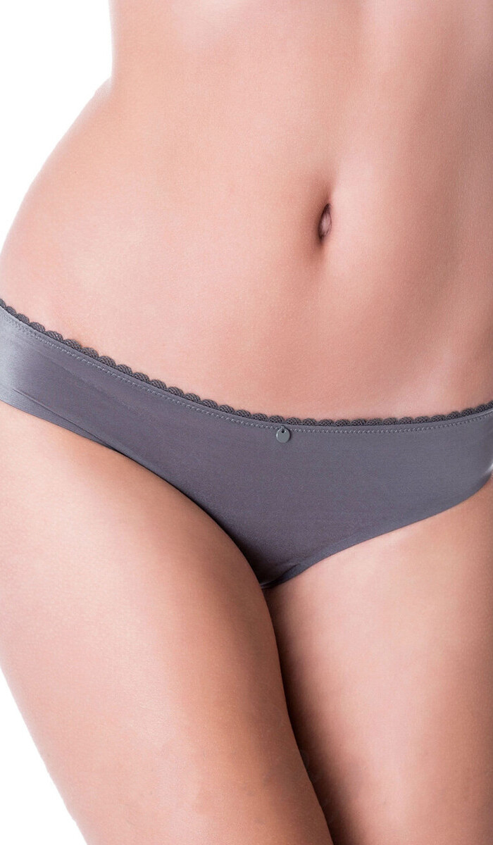 Сліпи виконані у благородному сірому кольорі. М’який, шовковистий матеріал дарує шкірі відчуття ніжності, а низька лінія талії зі спеціальною пласкою обробкою гарантує бездоганну посадку. Завдяки мінімальній кількості швів, ці трусики залишаються непомітними навіть під найвибагливішим вбранням, даруючи абсолютний комфорт протягом усього дня. Стильну «крапку» в дизайні ставить витончена фірмова підвіска спереду — маленький символ вишуканості.